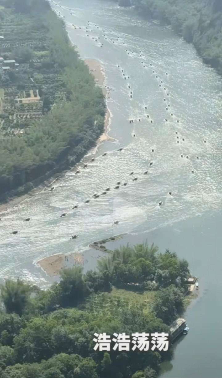 有网友发布视频显示,航拍阳朔漓江景区上,游船密密麻麻,一艘接着一艘,像在水上排队。有留言称场面堪比周瑜调集东吴水军,更有网友称“比马六甲海峡还忙”。